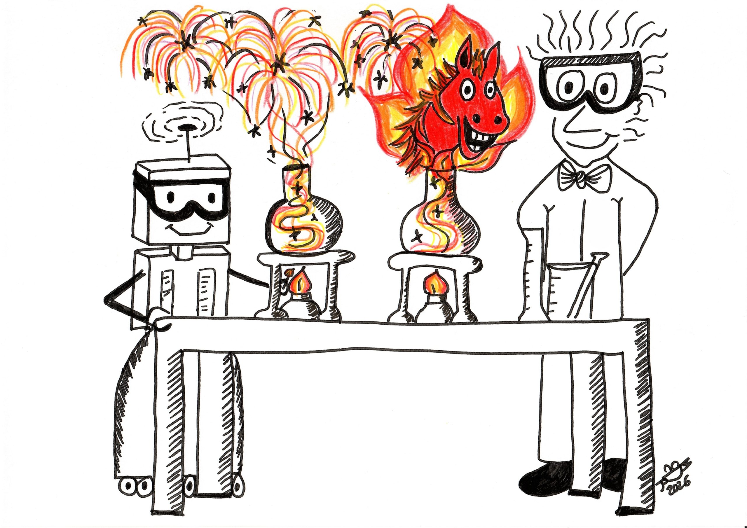 Cartoon showing the NanoWorld AFM professor and robot in the lab watching the lunar new year fire horse emerging from their experiments.